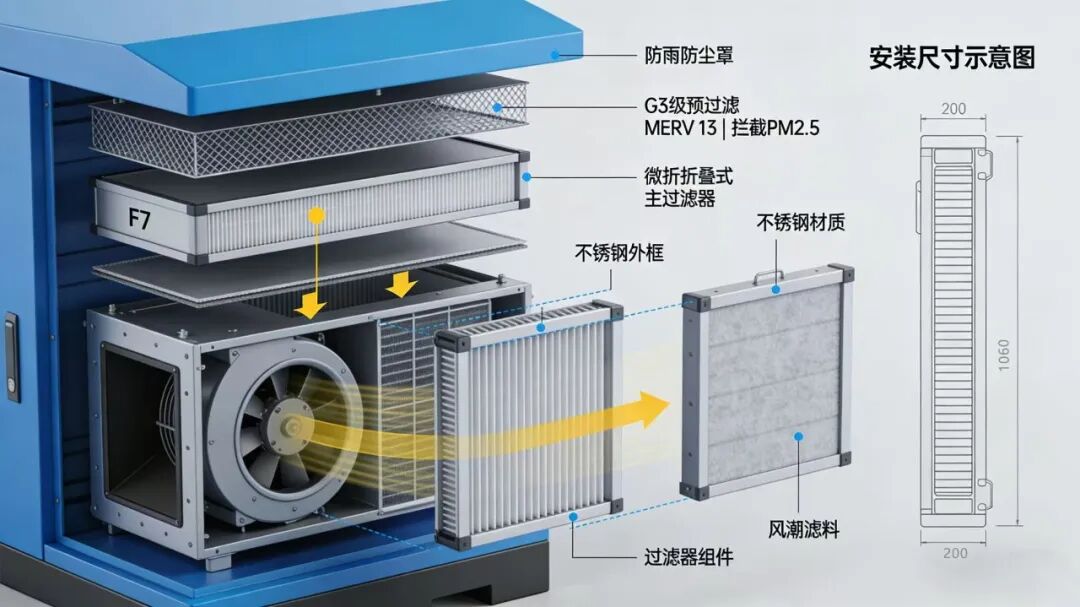 · 效率等级:通常选用MERV 10-13(对应F6-F7,或ISO ePM2.5~ePM1级),可有效捕获对散热和电路有害的细颗粒物(PM10, PM2.5)。